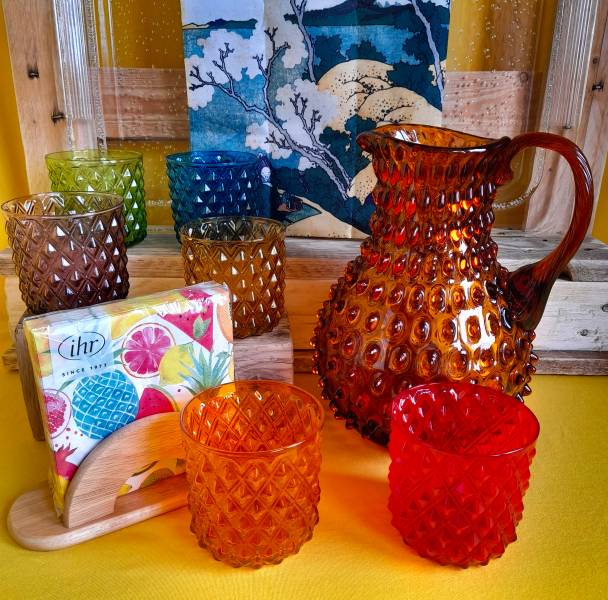 Se poi volete accompagnare i bicchieri colorati ad una caraffa colorata, la brocca riccio amber, richiama colore e superficie dei bicchieri.